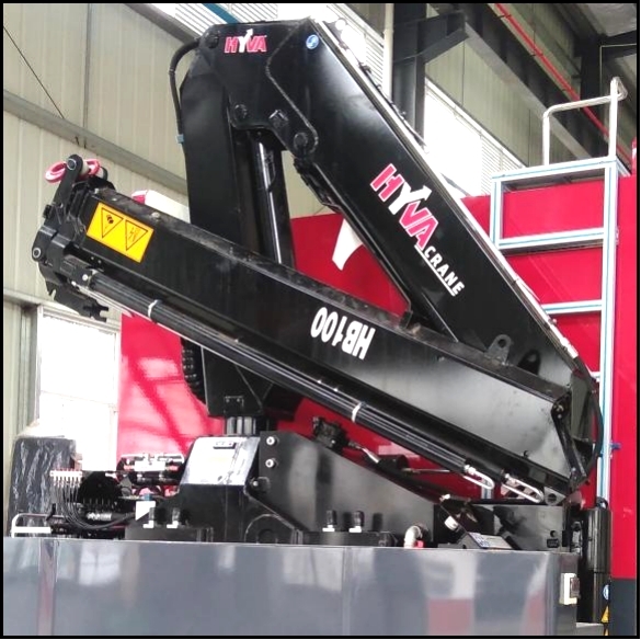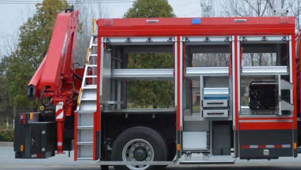吊装作业区主要装备折叠臂吊装设备,配备有伸缩臂液压支腿及双侧操控接口,吊装作业区左右侧均配备有器材舱,放置支腿垫木等随车器材装备,右侧还设计有登顶梯台,配备上车拉手及安全护栏。